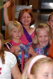 We had a lively conversation, ranging from the sleepover b-day party she’s having tomorrow night, to what she did in class this morning, to how much she likes her teacher Mrs. Embry. And almost as if the stars are just aligned for her benefit today, her big brother descends from his high and honorable perch up on the stage just to come over and get Callie’s attention. He stands her up and gives her a big hug and says “Happy Birthday, Callie”. Wow. Big brother, 2 years older, in front of God and all his classmates, hugging his sis.